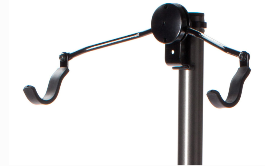 El Kani está equipado con dos soportes para bicicletas. Cada uno se puede montar en cualquier punto del pilar, por lo que puede definir las alturas superior e inferior en función de sus bicicletas específicas y la altura utilizable. Cada soporte es una base de extensión giratoria con dos brazos que pivotan en el centro y ganchos individuales para bicicleta que también pivotan. Puede apretarlos en su lugar una vez que defina la posición de la bicicleta, o dejarlos un poco menos apretados para una mayor flexibilidad.